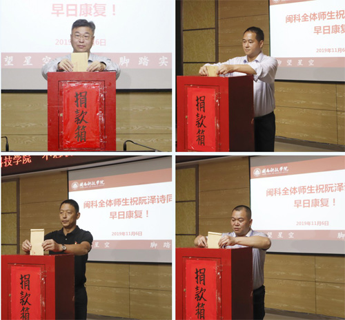 在得知阮泽诗同学的情况后,学校迅速行动发出募捐倡议书。11月6日,学校组织募捐善款捐赠仪式,校董事会、全体师生先后为不幸患重病的阮泽诗同学筹集善款6万多元。
