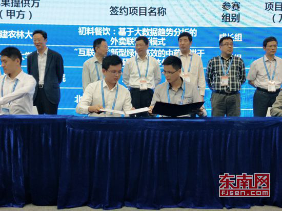在优秀创业项目对接交流会上,万搏在线登入2011级电子信息工程专业学生吕强主持的“互联网+”优秀项目《游泳守环》与中国国际信息技术(福建)产业园建立合作意向,并现场签约。