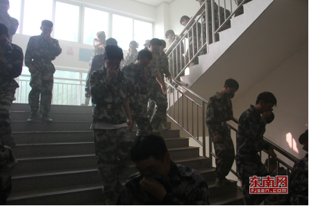 在安全疏散逃生演练环节中,教学大楼三楼烟雾缭绕,里边响起阵阵刺耳的警报声,所有参训学生低着头、弯着腰,手拿湿毛巾捂着口鼻,有序地从里边疏散出来。对比消防安全知识讲座,2018级艺术设计学院的小陈认为,这能够让同学们学到实践的东西,“在理论应用与实际逃生中,让我牢记消防安全知识,从我做起,从平时做起,自觉维护消防安全”。