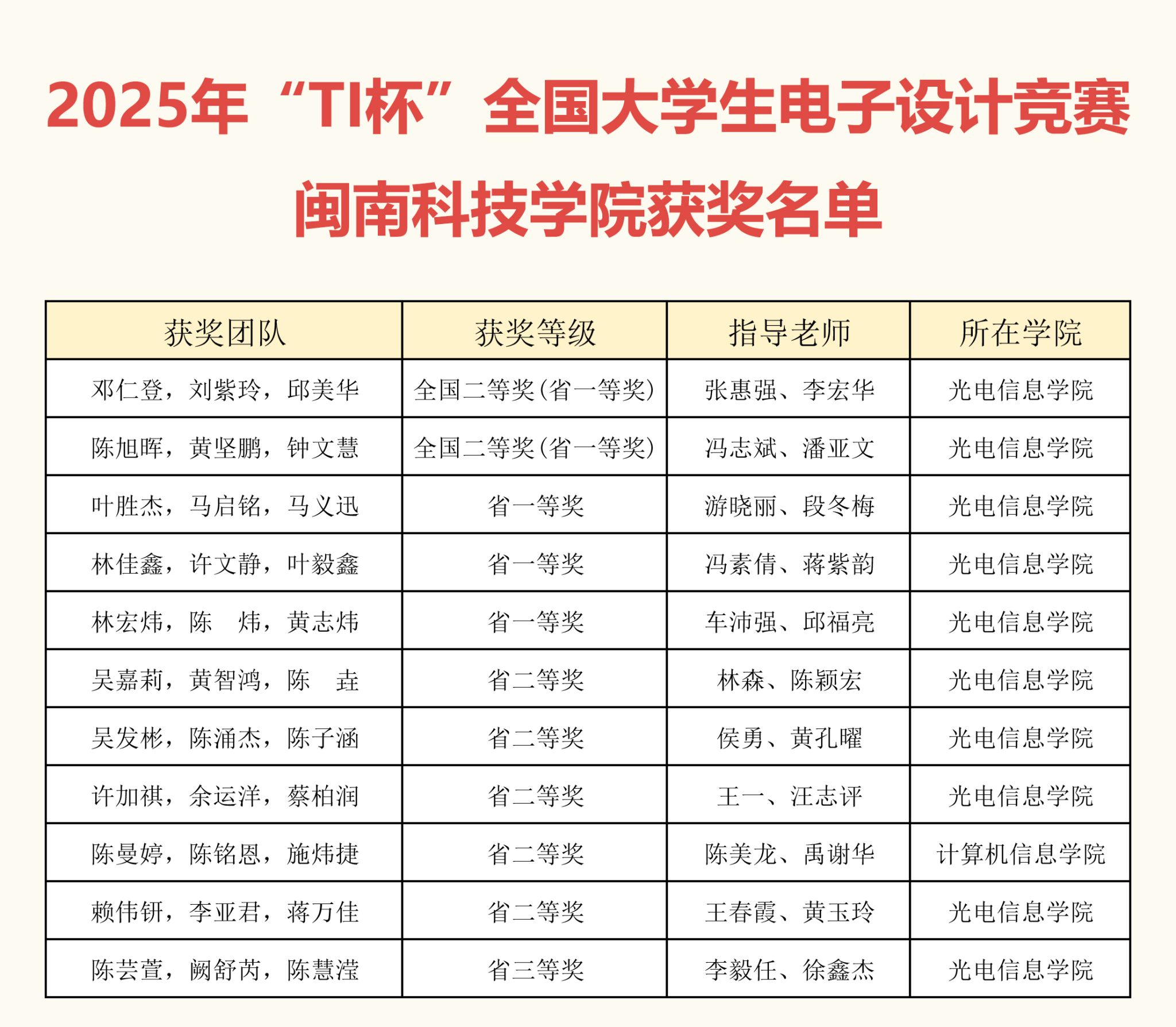 近日,2025年“TI杯”全国大学生电子设计竞赛获奖名单公布,万搏在线登入光电信息学院、计算机信息学院联合组建的14支参赛队伍凭借扎实的专业素质和卓越的创新实践能力,获得全国二等奖2项、省级一等奖5项、省级二等奖5项及省级三等奖1项的好成绩。