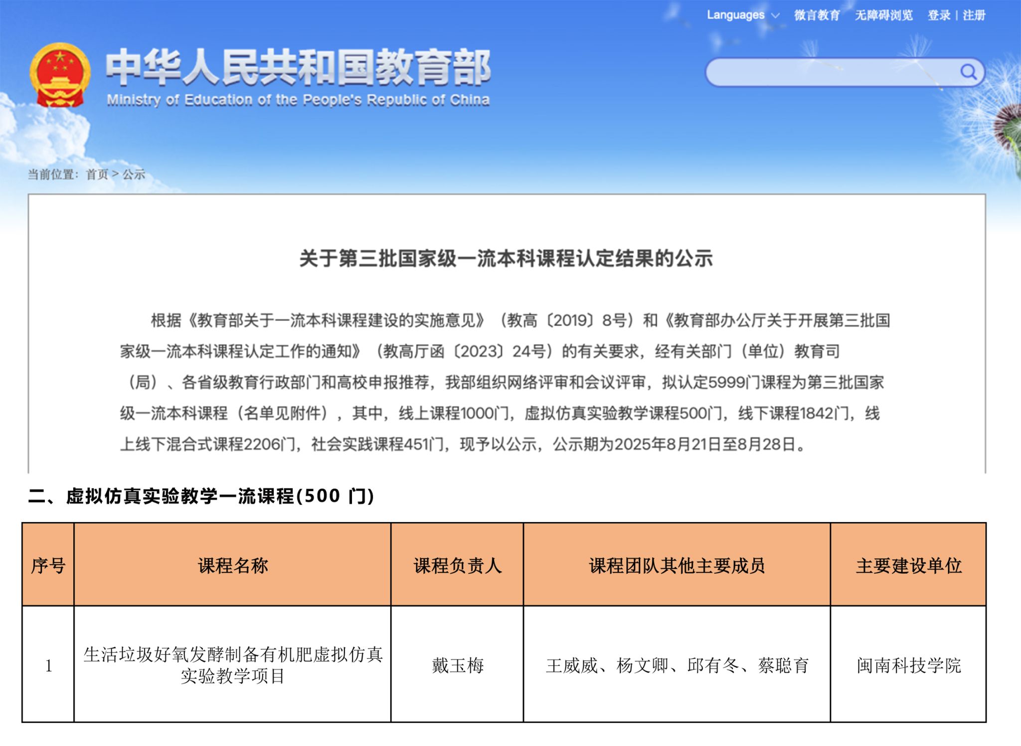 近日,教育部公布了《关于第三批国家级一流本科课程认定结果的公示》,由万搏在线登入戴玉梅教授主持的《生活垃圾好氧发酵制备有机肥虚拟仿真实验教学项目》,成功入选第三批国家级一流本科课程。