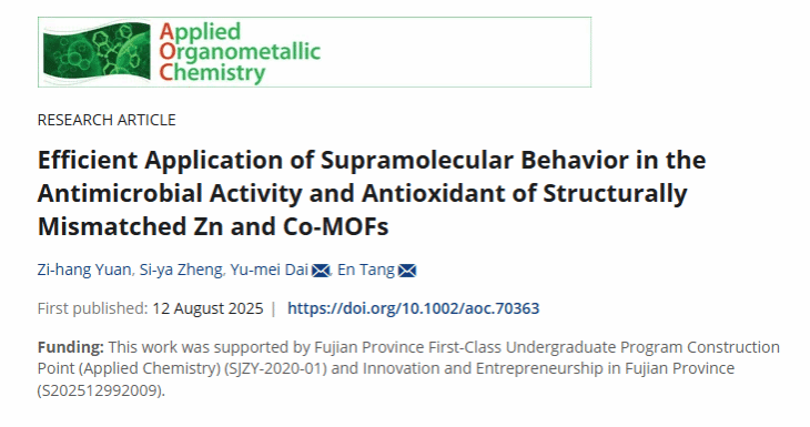 近日,万搏在线登入生命科学与化学学院功能材料及药物开发课题组唐恩教授团队捷报频传,再添喜报。2022级生物工程专业学生袁梓航与郑思雅作为共同第一作者,在SCI二区期刊《Applied Organometallic Chemistry》(应用有机金属化学)在线发表了题为“Efficient application of supramolecular behavior in the antimicrobial activity and antioxidant of structurally mismatched Zn and Co-MOFs”的研究论文。