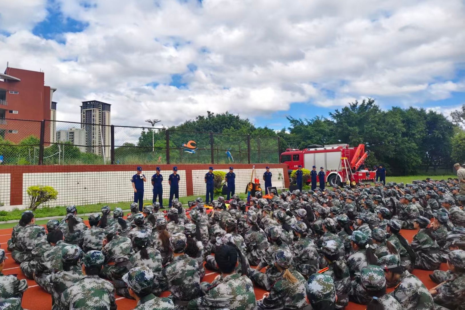 本次消防安全教育活动将消防安全知识融入到新生的军训课程中,让广大师生在军训期间就接受到了系统的消防安全教育,切实增强了师生们的消防安全意识和自防自救能力。