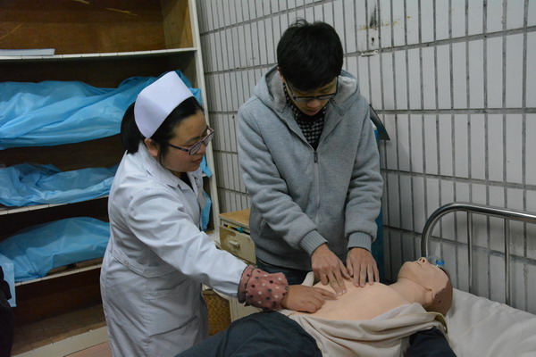 入党积极分子们来到南安市中医院,协助医院对病人进行有关满意度的问卷调查;探望病人,为他们送去水果、礼物以及亲切的问候。医院还安排了一位护士向同学们讲解急救的常识,指导同学们的急救技巧。
