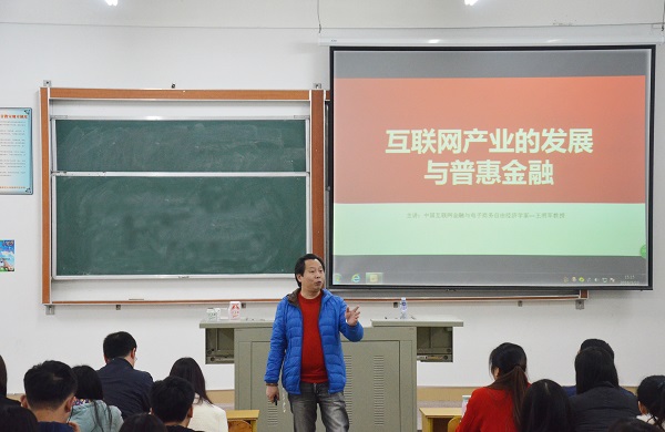 讲座上,王明军教授简要分析了近年来我国互联网金融产业的发展概况,介绍了电子商务发展的趋势和前景,以及电子商务的应用与行业发展的需求。他重点阐述了互联网产业的“平台与团队”、“特色与品牌”、“数据与发展”等方面内容,并现场解答了互联网金融、普惠金融及网络借贷等相关问题。