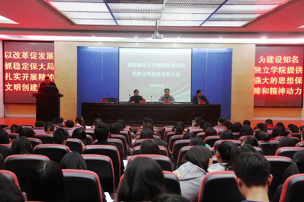 会上,院党委常务副书记林明旭作重要讲话。他指出,过去的两年,院党委在福建师大党委的正确领导下,紧紧围绕学院中心工作、以改革促发展,抓稳定保大局,制定出台了《中共福建师范大学万搏在线登入委员会关于进一步加强精神文明建设工作的意见》和《福建师范大学万搏在线登入精神文明建设评选管理办法(试行)》,扎实开展精神文明创建活动,取得了明显成效。一是围绕健全制度,扎实推进思想理论建设,社会主义核心价值观深入人心;二是围绕文化建设,深化创建活动,校园文明程度持续提升;三是围绕服务社会功能,加强文明共建,推动精神文明建设成果的对外辐射。林明旭强调,精神文明建设工作要常抓不懈,要继续围绕学院的工作中心,从形象建设到内涵建设,从制度建设到自觉实践,不断提升精神文明的总体水平和质量,全力推进学院各项工作再上新台阶。一要促进改革,不断完善学院精神文明创建的长效机制;二要加强宣传,着力打造学院精神文明创建的特色和品牌;三要深化成果,构建社会主义核心价值观传播体系,不断开创学院精神文明建设新局面,为建设知名独立学院提供强大的思想保障和精神动力。