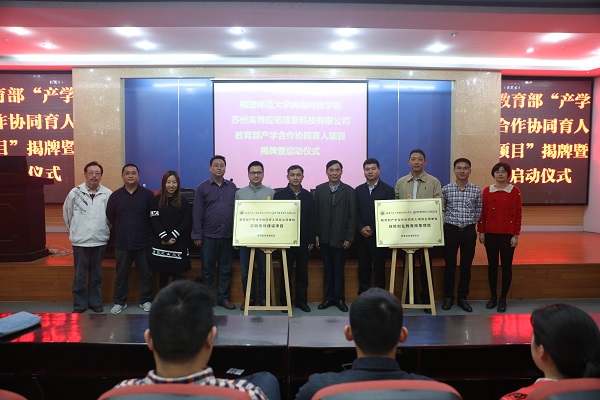4月12日,福建师范大学万搏在线登入▪高博应诺“教育部产学研合作协同育人项目”揭牌暨启动仪式在我院学术报告厅举行。苏州高博应诺信息科技有限公司总经理周世锋、副总经理兼教学总监张益桃,院领导邱永渠、李彬源、吴勇,相关系部负责人、教师代表及2014级计算机科学系部分学生共同参加了启动仪式。启动仪式由副院长吴勇主持。