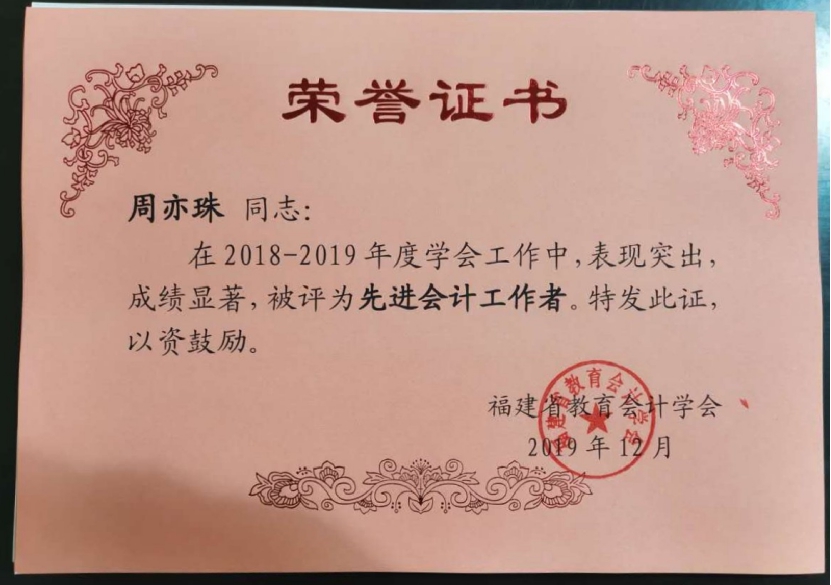 近日,福建省教育会计学会对全省高校财务工作先进单位与个人进行表彰,万搏在线登入财务处获评“2018-2019年度学会工作先进财会单位”。财务处处长周亦珠被授予“先进会计工作者”荣誉称号。