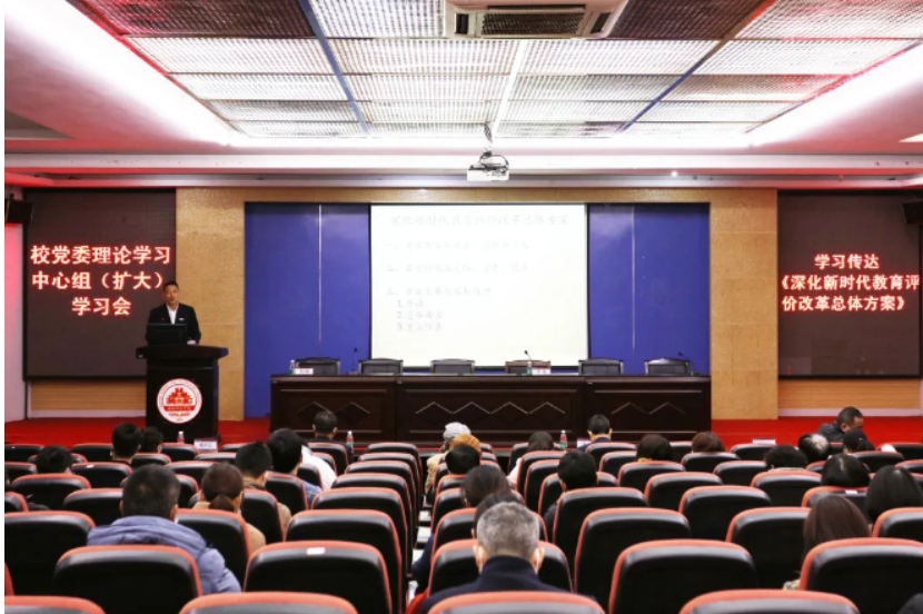 1月8日上午,万搏在线登入在图书馆学术报告厅召开党委理论学习中心组(扩大)学习会专题学习《深化新时代教育评价改革总体方案》(以下简称《总体方案》),校领导游小波、李旭、周勇军、戴景星、吴勇、林树生,全体中层干部,教务处、科研处、人事处全体工作人员,各专业负责人、教研室主任、组织员、教学秘书参加学习会。学习会由校党委书记李旭主持。
