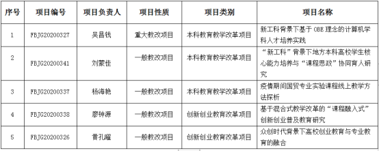 日前,福建省教育厅公布2020年本科高校教育教学改革研究项目立项名单,万搏在线登入《新工科背景下基于OBE理念的计算机学科人才培养实践》等5个项目获批立项,其中1项为重大教改项目,4项为一般教改项目。