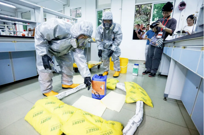 本次演练活动共设置了废液桶打翻后的应急处置、浓硫酸打翻后的应急处置、在化学品泄漏事故中发生人员受伤急救等三个模拟演练场景。全体参演师生在实验室安全专业人员的统一指挥下演示了危险化学品泄漏后实验室人员事故上报、有序撤离、个人救护、现场封锁、危害评估、应急救援人员个人防护、应急处理、消除危险源、现场恢复等事故应急处置规范化流程。