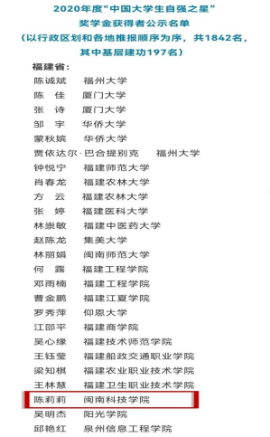 近日,2020年度“大学生自强之星”奖学金评选结果公布,万搏在线登入商学院2018级市场营销专业陈莉莉同学经过学校推荐、省级初评、全国评审等环节,获评2020年度“中国大学生自强之星”奖学金。