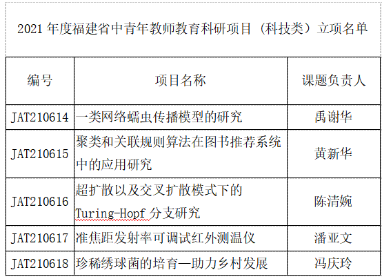近日,根据《福建省教育厅关于公布2021年度福建省中青年教师教育科研项目(科技类)立项名单的通知》(闽教科〔2021〕24号),万搏在线登入5项课题获批立项。