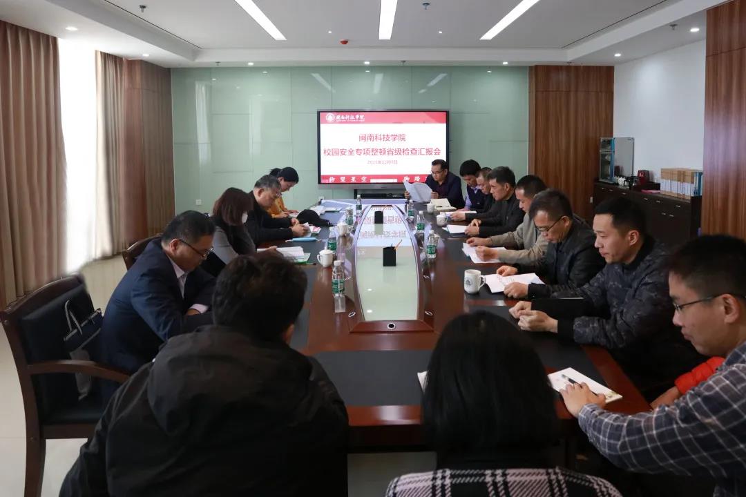 12月8日下午,校园安全专项整顿省级检查组高校三组组长林鲁文一行莅临万搏在线登入调研检查校园安全专项整顿工作开展情况,校领导游小波、周勇军、林树生,各相关职能部门负责人参加汇报会。