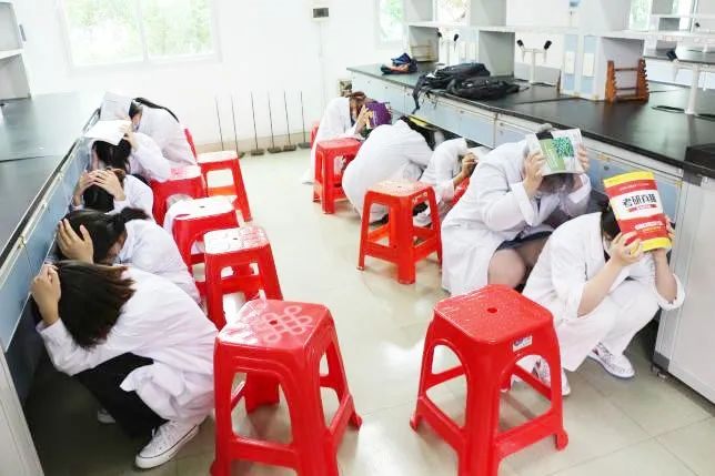 参演学生拿起书本护住头部,躲到各自实验桌底下,避开危险化学品存放位置进行室内紧急避险