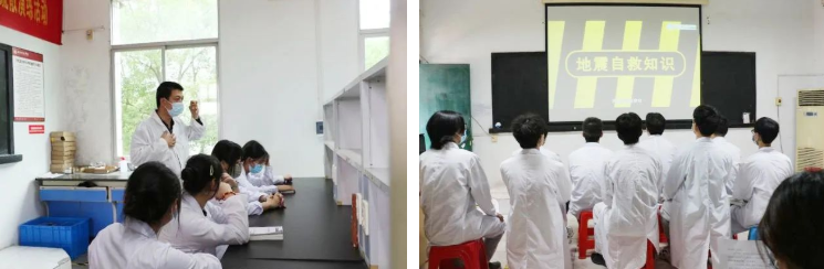 在演练现场,教师组织学生观看防震避险教育视频,并从实用性强、贴近生活的安全知识入手,用通俗易懂的语言深入浅出、生动形象地讲解当校园内发生地震时应如何组织疏散和逃生自救。并现场示范了心肺复苏、气道梗塞、创伤急救等实验室常用救护措施,有效强化了参演师生的防灾避险意识。