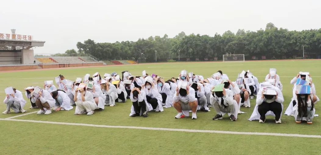 参演学生按既定路线迅速有序地撤离到学校南侧田径场,用课本或双手护头并快速蹲下进行室外逃生避险
