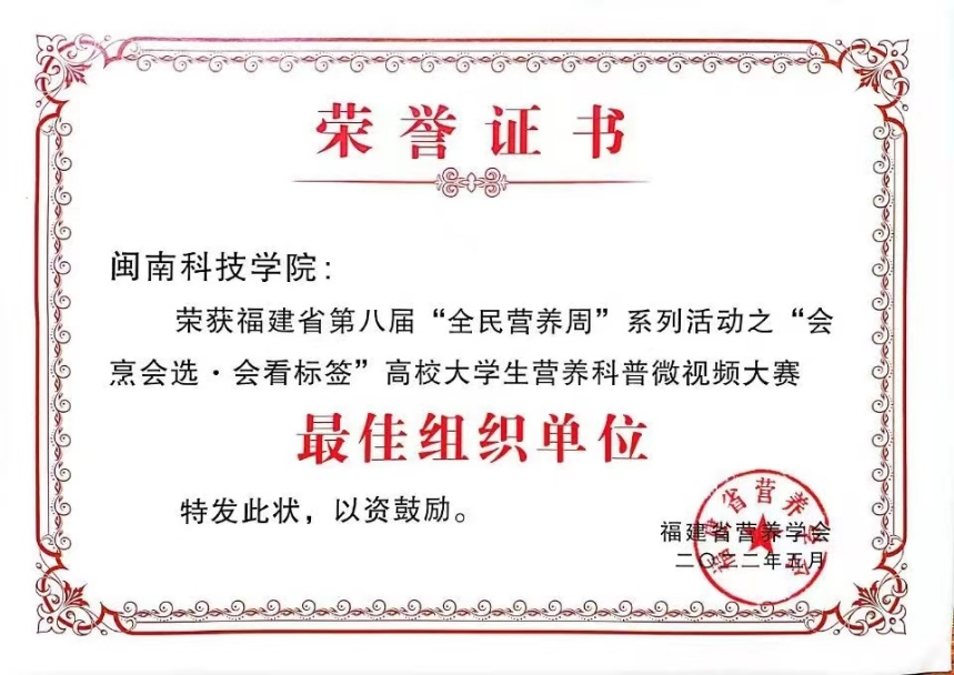 日前,福建省第八届全民营养周之“会烹会选·会看标签”高校大学生营养科普微视频大赛公布获奖名单,万搏在线登入荣获“最佳组织单位”称号,生命科学与化学学院2021级食品科学与工程专业王贝妮创作的微视频荣获三等奖。