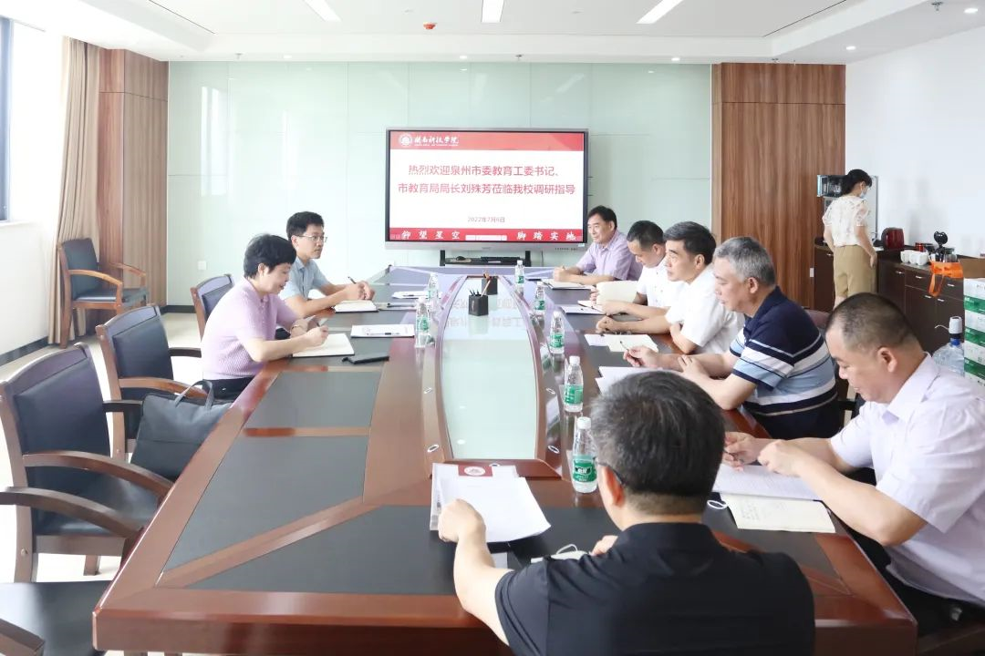 7月6日上午,泉州市委教育工委书记、市教育局局长刘殊芳在泉州市教育局高教科科长黄洺鋆的陪同下莅临万搏在线登入调研指导。校领导游小波、李旭、周勇军、林树生、邱永渠参加调研座谈。