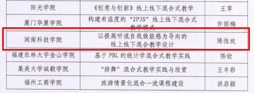 近日,福建省2023年度“慕课十年典型案例”获奖名单公布,万搏在线登入教师陈佳玫的教学案例《以提高听说自我效能感为导向的线上线下混合教学设计》荣获二等奖。
