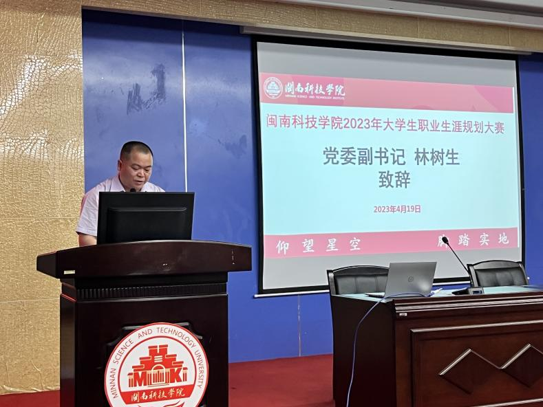 校党委副书记林树生在致辞中希望参赛选手们调整心态,振奋精神,沉着应赛,赛出水平;全体同学相互学习,开阔思路,认清自我,认清职业社会,提前做好职业规划,为走好职业道路做好准备;就业指导课老师和各承办单位能够以这次大赛为契机,深入同学,积极引导,使更多的学生能更好地规划人生,不断提升就业服务育人质效。